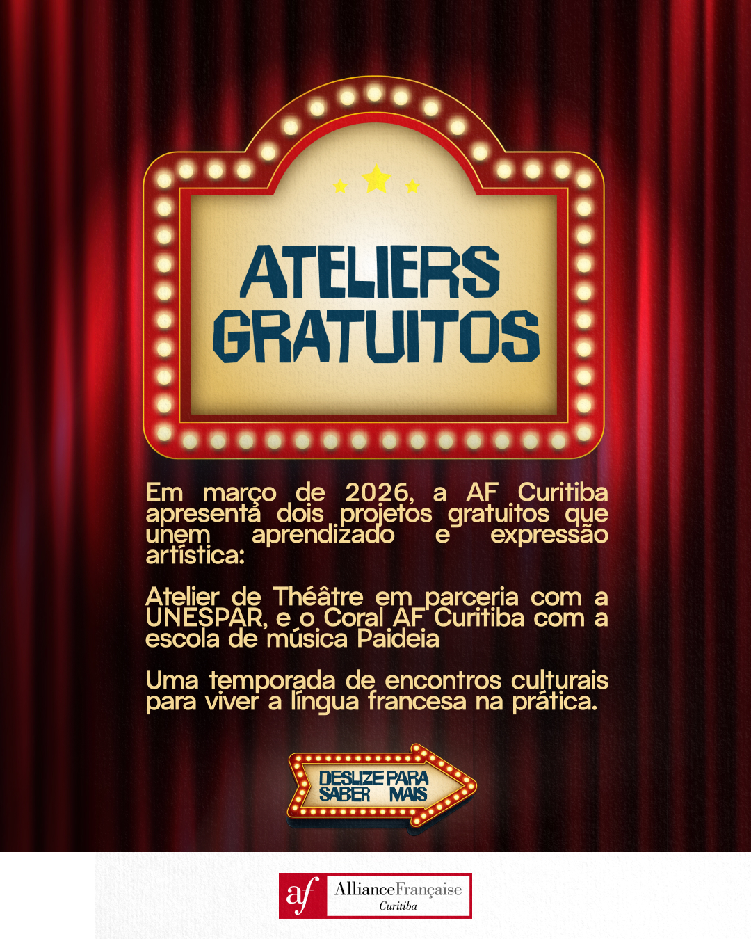 A Bolsa Social é uma iniciativa da Aliança Francesa de Curitiba que amplia o acesso ao estudo do francês por meio de um processo de inscrição e seleção. Se você tem interesse em participar, o caminho é simples: basta se inscrever dentro do prazo e acompanhar as orientações no site.
