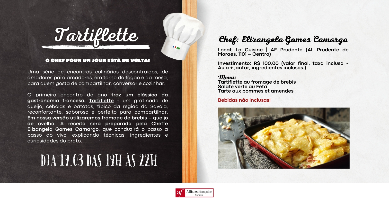 O primeiro encontro do ano traz um clássico reconfortante da gastronomia francesa: Tartiflette, um gratinado de queijo, cebolas e batatas típico da Savoia — perfeito para noites de outono e para compartilhar.