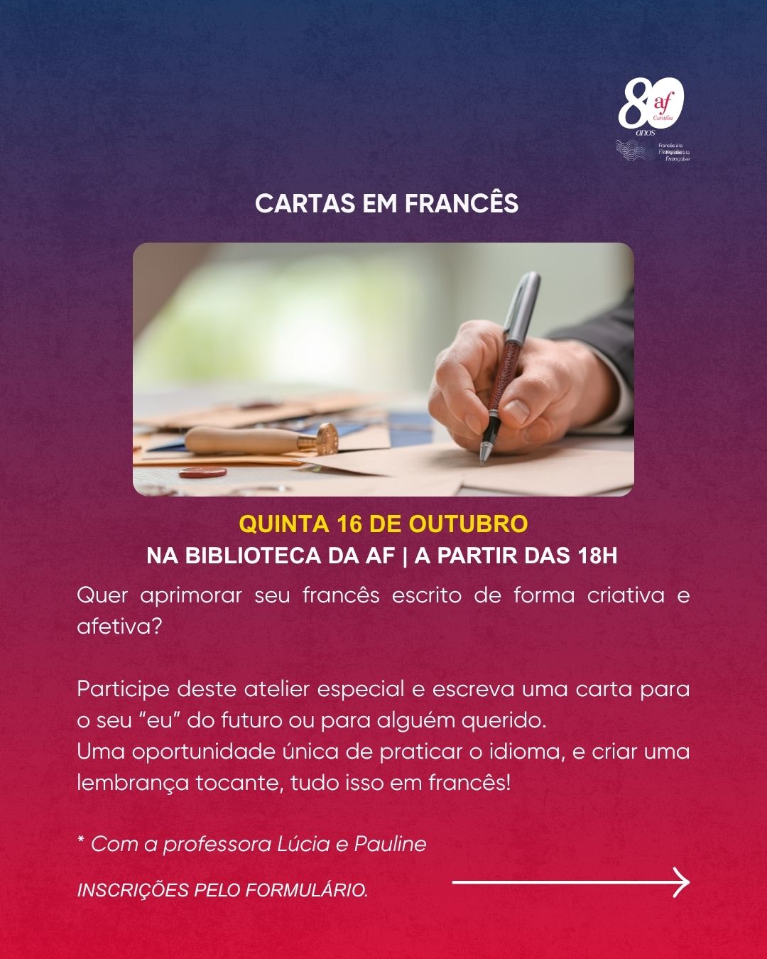 Participe de um atelier especial em francês com a professora Lúcia e Pauline, onde você poderá aprimorar seu francês escrito de forma criativa !